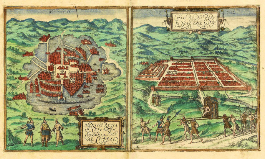 Cusco und Mexico, das heutige Mexico City; 1572; Mexico befindet sich noch im später nahezu vollständig überbauten Texcocosee.